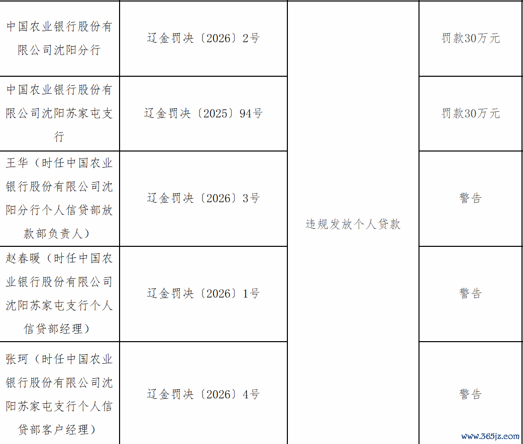 1月9日,辽宁金融监管局行政处罚信息公示列表显示,中国农业银行股份有限公司沈阳分行及中国农业银行股份有限公司沈阳苏家屯支行因违规发放个人贷款分别被罚30万元;责任人王某、赵某暖、张某被警告。